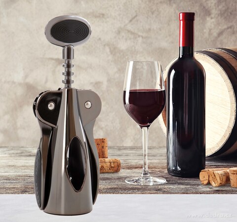 Elegantní celokovový pákový KORKOTVÍRÁK s křidélky pro snadné otevírání vín s korkovou zátkou. Moderní kouřově černý design, lesklý kovový povrch a silikonové protiskluzové prvky na rukojeti i točítku zajišťují pohodlné a bezpečné použití. Ideální i jako stylový dárek pro milovníky vína.
