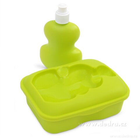 Sada uzavíratelné dózy na potraviny a flaštičky na nápoj. Box a flaštička je vyrobena z tvrzeného plastu. Lze mýt v myčce, vhodné do chladničky i mrazničky.