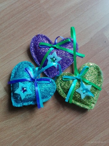 3 ks závěsná třpytivá textilní dekorace, celková délka cca 15 cm (včetně stuhy).