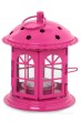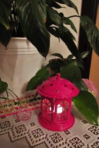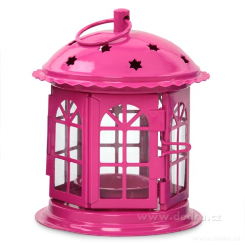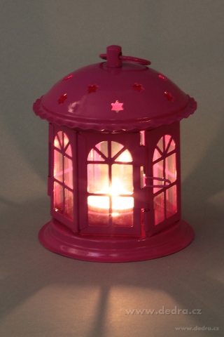 Kovová lucerna s detailně propracovanými ozdobnými vzory a skleněnými výplněmi. Dvířka jsou opatřena západkou.
