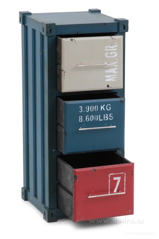 CONTAINER STYLE SKŘÍNĚ A ÚLOŽNÉ BOXY V DESIGNU KONTEJNERU V designu kontejneru, realistický vzhled se záměrnou patinou, originální nápisy.Industriální bytový styl. Dřevěná petrolejová komoda se 3 barevnými zásuvkami ve tvaru přepravního kontejneru, kovové úchyty. Rozměr: Š 35 x H 31,5 x V 82 cm.