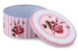 Kovová kulatá dóza s víkem.Rozměr: průměr 14 cm, výška 7,5 cm Kolekce s motivem v moderním romantickém duchu.Pastelové odstíny modré a růžové s motivem růží a jemnýchmotýlů s citlivě zakomponovanými moderními prvky pruhůa puntíků dodají interiéru smyslnou tečku originality a něžnosti. Využijete na uchovávání upečených dobrot, např. na cukroví, su...