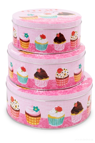 Kulatá kovová dóza s víkem s motivem CUPCAKES.Díky provedení z kovu se dózy nepromáčknou, obsah je nepoškozen a ochráněn. Dózy využijete na uchovávání upečených dobrot, např. na cukroví, sušenky, oříšky, bonbóny,... Jednotlivé dózy lze také použít na různé drobnosti. Kovové dózy lze vkládat do sebe = zaberou minimum místa pokud je nepoužíváte. Max....