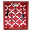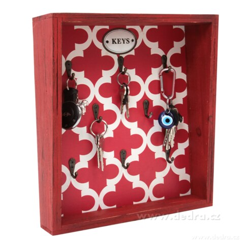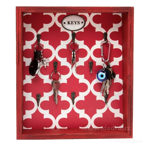 Závěsná police s 8 háčky na klíče. Vyrobeno ze dřeva a kovu s patinovaným povrchem. Červeno-bílá kombinace. Rozměr: Š 30 x H 10 x V 34 cm.