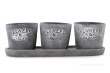 Tři masivní keramické obaly na květináč s nápisem FLOWERS-&-GARDEN na podnose. Záměrně patinový povrch. OBALY NA KVĚTINÁČE jsou ideální na bylinky i květiny. Protiskluzová spodní část. Rozměr 1 obalu: 10,5 x 10,5 x 9 cm Celkový rozměr: 34 x 12 x 10 cm