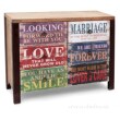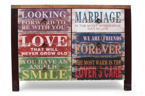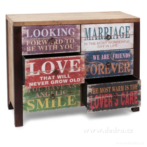 Komodová skříň se 6 velkými zásuvkami, dřevo se záměrnou patinou, motivy nápisů, kovová madla.