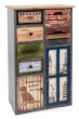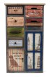 Vysoká komodová skříň s různými motivy (velkoměsta, pes, nápisy, razítka). Dominanta, která ozvláštní interiér a nabízí spoustu prostoru k uskladnění: 6 zásuvek + 2 úložné prostory s otevíracími dvířky.