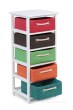 Dřevěný regál/komodase s 5 výsuvnými košiš 36 x h 33 x v 86,5 cm, s výsuvnými boxy- koši v různých barvách (multicolor). MULTICOLOR PATROVÉ REGÁLYIdeální na uskladnění drobností v dětském pokojíčku, spodníhoprádla v ložnici, hřebenů a sponek v koupelně. Polstrované boxy - vnější část z odolného textilu s lanovými úchyty.