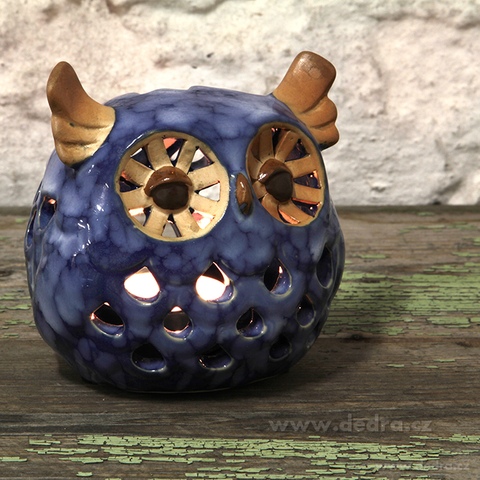 Keramický svícen, ve tvaru sovy menší | mramorově modrý
