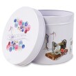 Kulatá kovová dóza s víkem s motivem šicích potřeb.