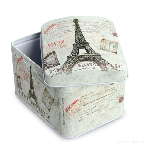 Obdélníková kovová dóza s víkem s motivy Paříže.