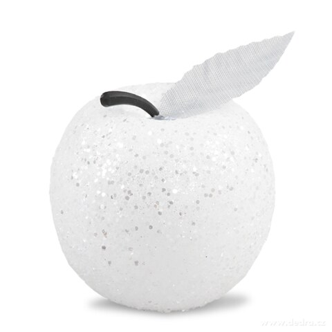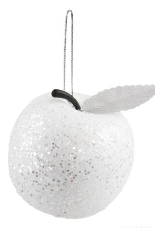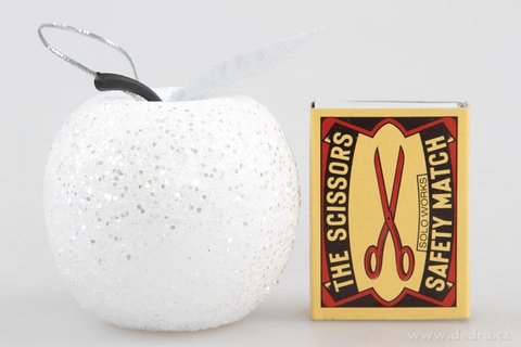 6 ks ozdob ve tvaru jablíček v bílé barvě se stříbrnými třpytkami s lístkem a stopkou, výška všech: 5,5 cm.