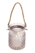 Skleněný kouřový svícen s lanovým uchem na přenášení, na čajovou nebo menší válcovou svíčku, reliéfní povrch.