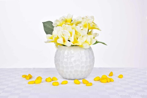 Skleněná váza s reliéfním povrchem. Lze použít i jako svícen na čajové či valcové svíčky.