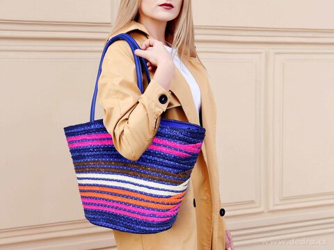 Chceš být výrazná a stylová? Určitě se ti bude hodit krásná kabelka v modré barvě s barevnými pruhy vyrobená z pevného kukuřičného šustí, do které se ti vejde vše potřebné.......báječně s ní budeš vypadat na pláži, u vody, bazénu i při procházkách letním městem či parkem. MADISON velká stylová kabelka s dlouhými uchy z ekokůže pro pohodlné nošení...