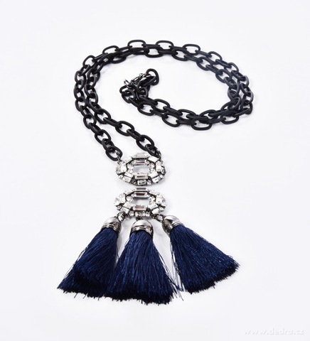 Okouzlí při každé příležitosti.Šperk není jen doplněk, šperk vyjadřuje Váš vkus a povahu. Skvěle se hodí ke společenské róbě, na promoce, svatby nebo večírky, ale stejně vkusně doplní Váš každodenní outfit. POMPON & BRILLANT černý matný řetízek s velkými oky, dva ovály zdobené třpytivými kameny a tři textilní indigo pompony.Celková délka 80 cm.