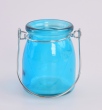 Svícen na čajovou svíčku v pastelové tyrkysové barvě s praktickým kovovým držadlem.
