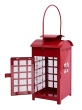 Kovová lucerna TELEPHONE červená ve tvaru telefonní budky se skleněnými výplněmi a kovovým držákem na přenášení či zavěšení, zavírání na kovovou západku.