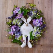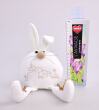 Sedící plyšový zajíc v bílé barvě s vyšívaným motivem, pevné polstrované tělo uvnitř s