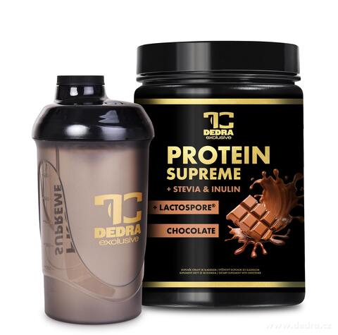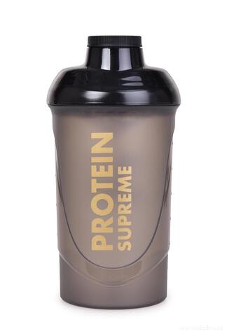 Shaker PROTEIN SUPREME se sítkem, šroubovacím víkem, náustkem na pití.