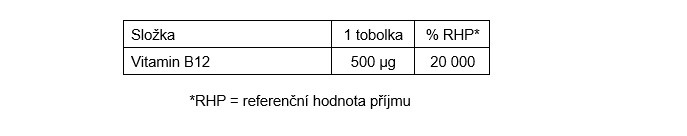 Složení: plnidlo: mikrokrystalická celulóza, methylcobalamin (vitamín B12). Obal tobolky: hydroxypropylmethylcelulóza.