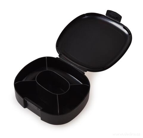 Praktický plastový zásobník PILLBOX s 5 samostatnými přihrádkami a pevně zavíratelným víčkem. Ideální pro kapsle, tablety nebo drobnosti – udržuje je čisté, přehledné a po ruce. Kompaktní rozměry (10,8×9,5×3 cm), vhodný na cesty i do každodenního provozu.