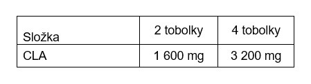 Složení 1 tobolky: saflorový olej (olej ze semen světlice barvířské) 1 000 mg, z toho konjugovaná kyselina linolová (CLA) 800 mg. Obal tobolky: želatina, glycerin, čištěná voda.