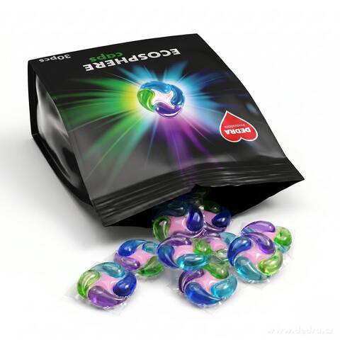 Koncentrované univerzální kapsle na praní ECOSPHERE caps pro bílé i barevné prádlo. Účinné od 30 do 95 °C, s enzymy, bez optických zjasňovačů a bez plniv. Biologicky odbouratelné složení, intenzivní ovocná vůně a komfort moderního praní.