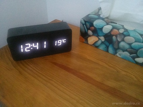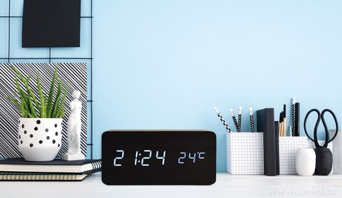 WOODOO CLOCK – stylové digitální LED hodiny s budíkem, které ukazují čas, datum i teplotu. 3 alarmy, nastavitelný jas, zvukové ovládání (tleskni/poklepej) a elegantní dřevěný design vhodný do ložnice i kanceláře.
