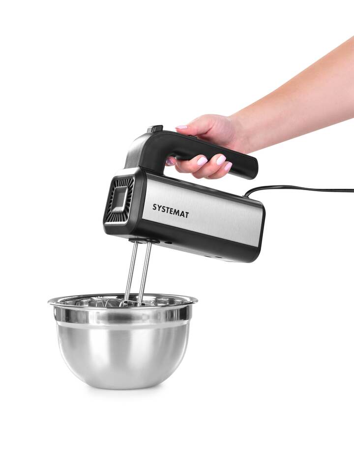 SYSTEMAT – výkonný ruční šlehač a hnětač 300 W s 5 rychlostmi. Nerezové metly a háky zvládnou šlehačku, sníh i hutná těsta. Jednoduché uvolnění nástavců a 2m kabel pro pohodlné používání v každé kuchyni.