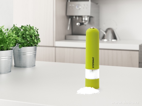 Elegantní elektrický mlýnek SYSTEMAT XXL na sůl, pepř a koření s LED osvětlením a nastavitelnou hrubostí mletí. Ergonomický soft-touch povrch, keramický mlecí mechanismus a jednoduché ovládání jedním tlačítkem. Na 4× AA baterie. Výška 22 cm.