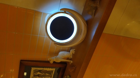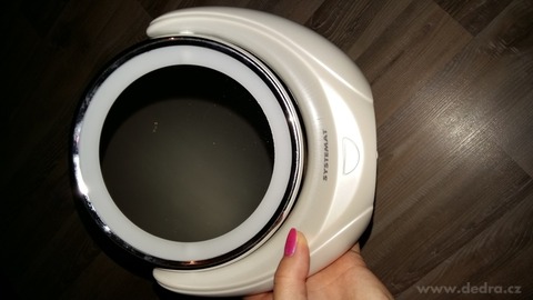 Rozměry: průměr zrcadlové plochy 11 cm, průměr zrcadlové plochy s LED osvětlením 13,4 cm, celkem š 18 x h 9 x v 20 cm.