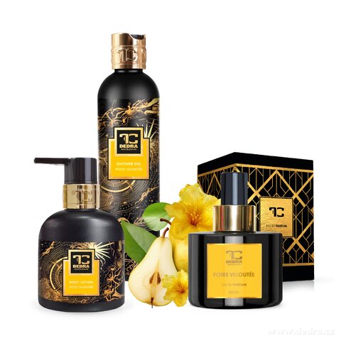 Luxusní dárková sada SAMETOVÁ HRUŠKA 1+2 ZDARMA: parfémová voda 100 ml, tělové mléko 320 ml a sprchový gel 320 ml. Sladká elegance hrušky a melounu s růží, frézií, pačuli a ambrou.