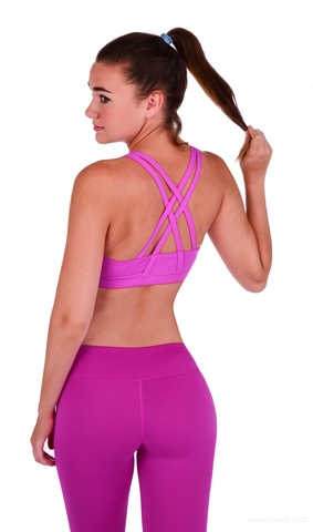 Sportovní podprsenka s vyjímatelnými vycpávkami a všitou vzdušnou látkou pro max. odvětrání, vzadu ozdobně křížená ramínka. Materiál: 87% Nylon, 13% Spandex.