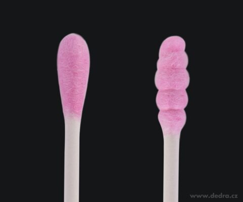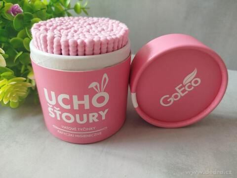 Ekologické vatové tyčinky UCHOŠŤOURY (200 ks) s pevnou kartonovou tyčinkou z recyklovaného papíru a 100% bavlnou. Růžová varianta v EKO obalu, dva tvary konců pro hygienu i kosmetiku.