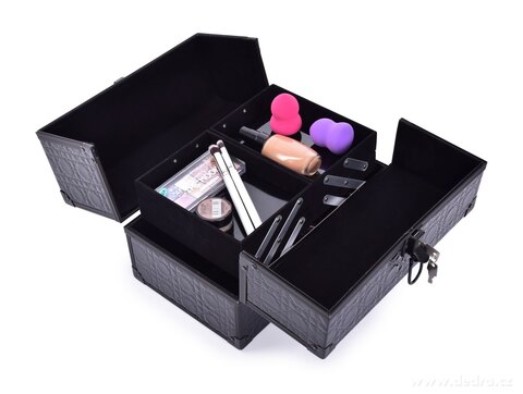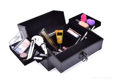 Kosmetický rozkládací kufřík na přepravu a uskladnění materiálu s pevnou rukojetí pro snadné přenášení, uzamykatelný (součástí 2 klíče), oboustranné otvírání. Povrch z efektní prošívané ekokůže s kovovými a plastovými doplňky. Vnitřní hluboký prostor a 4 výsuvné přihrádky se sametově černým povrchem, spodní část kufříku a přihrádek vybavena plastovou podložkou pro snadnou údržbu.