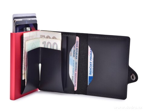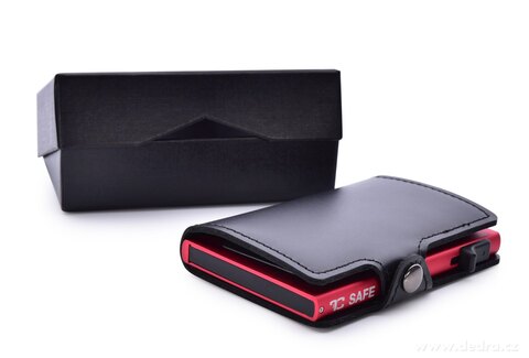 FC SAFE kožená inovativní peněženka pro ochranu bezkontaktních platebních karet v koženém pouzdru se zavíráním na patent, uvnitř hliníkové pouzdro na 4 - 6 karet s chytrým systémem pro snadné vysouvání karet a chlopní pro uchycení papírových bankovek.