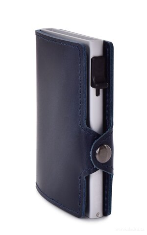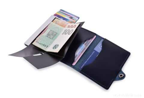 FC SAFE kožená inovativní peněženka pro ochranu bezkontaktních platebních karet v koženém pouzdru se zavíráním na patent, uvnitř hliníkové pouzdro na 4 - 6 karet s chytrým systémem pro snadné vysouvání karet a chlopní pro uchycení papírových bankovek.