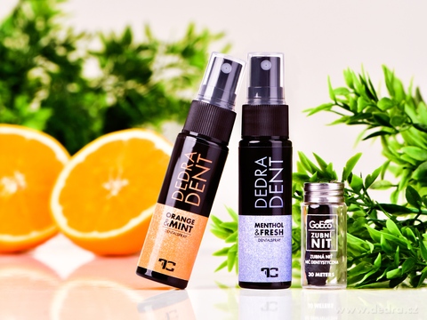 Přírodní ústní sprej DEDRA DENT® ORANGE & MINT s pomerančovým olejem, mátou, hřebíčkem a mentolem. Slazený xylitolem a stévií, bez cukru a chemických konzervantů. Okamžitě osvěžuje dech a působí antibakteriálně.