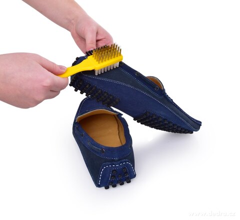 PRAKTIK 3v1 kartáček na broušenou kůži, nubuk, semiš a velur. Mosazné drátky odstraní hrubé nečistoty, pryžová část uhladí povrch a boční štěteček vyčistí švy a těžko dostupná místa. Obnovuje vzhled obuvi bez poškození materiálu.