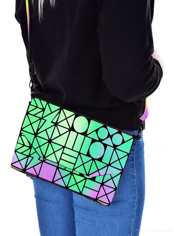 Ve tmě se při dopadu světla rozsvítí reflexní povrch. Designová kabelka s geometrickými vzory, díky které na každé párty či oslavě zaručeně zazáříš!