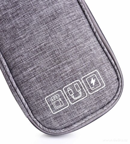 Kompaktní pouzdro na kabely a elektroniku FC TRAVELLER z šedé melange textilie. Uvnitř síťované kapsy, pružný popruh a klopa pro uspořádání příslušenství. Praktické na cesty, do práce i home office. Rozměry 12,5 × 3,5 × 19 cm.