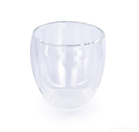 Dvoustěnná termo sklenice 250 ml z borosilikátového skla pro horké i studené nápoje. Udrží ideální teplotu nápoje, nepálí do ruky a působí elegantně – vhodná na cappuccino, espresso i drinky.