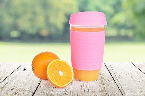 KELIMERO® skleněný hrnek se silikonovým odnímatelným páskem a víčkem, silnostěnné borosilikátové sklo. Průměr 8,5 cm. Objem 500 ml, výška 14,3 cm (s víčkem 16,5 cm).