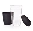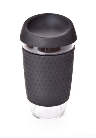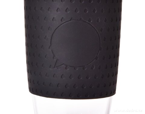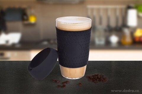 KELIMERO® skleněný hrnek se silikonovým odnímatelným páskem a víčkem, silnostěnné borosilikátové sklo. Průměr 8,5 cm. Objem 500 ml, výška 14,3 cm (s víčkem 16,5 cm).