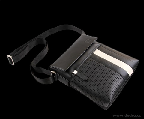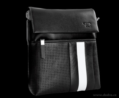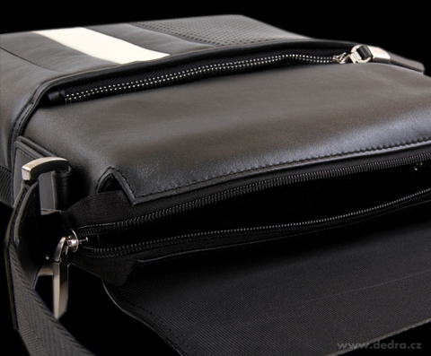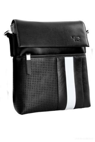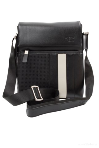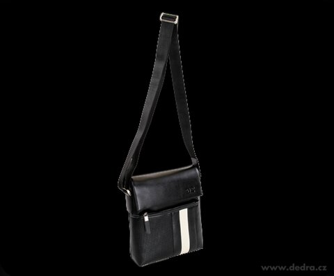 Kombinace hrubého pevného nylonu a ekokůže. Přední část s výrazným bílým pruhem a velkoplošnou perforovanou plochou. Nastavitelný popruh přes rameno. Embosovaný monogram na přední části a popruhu. Velká přední kapsa na zip, zadní velká kapsa na patent. Zevnitř velká kapsa na zip, kapsa na mobil a chlopně na tužky. Magnetické zavírání. Rozměr bez popruhu: 29 x 27 x 8 cm.