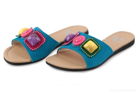 Střevíčky se sametovým povrchem zdobeny barevnou aplikací v podobě drahých kamenů. Vnitřní část z měkkého příjemného materiálu, gumová podrážka.