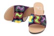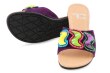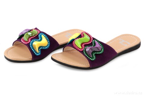 Střevíčky se sametovým povrchem zdobeny barevnou aplikací v podobě drahých kamenů. Vnitřní část z měkkého příjemného materiálu, gumová podrážka.