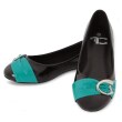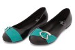 Elegantní baleríny z černé lesklé ekokůže s barevným proužkem a kovovou přezkou. Vnitřní část z měkkého příjemného materiálu, gumová podrážka.