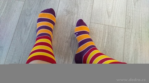 Barevné vysoké ponožky se širším horním lemem. Materiál: 74% bavlna, 24% PES, 2% elastan (je elastický a drží tvar), univerzální velikost 38-42.